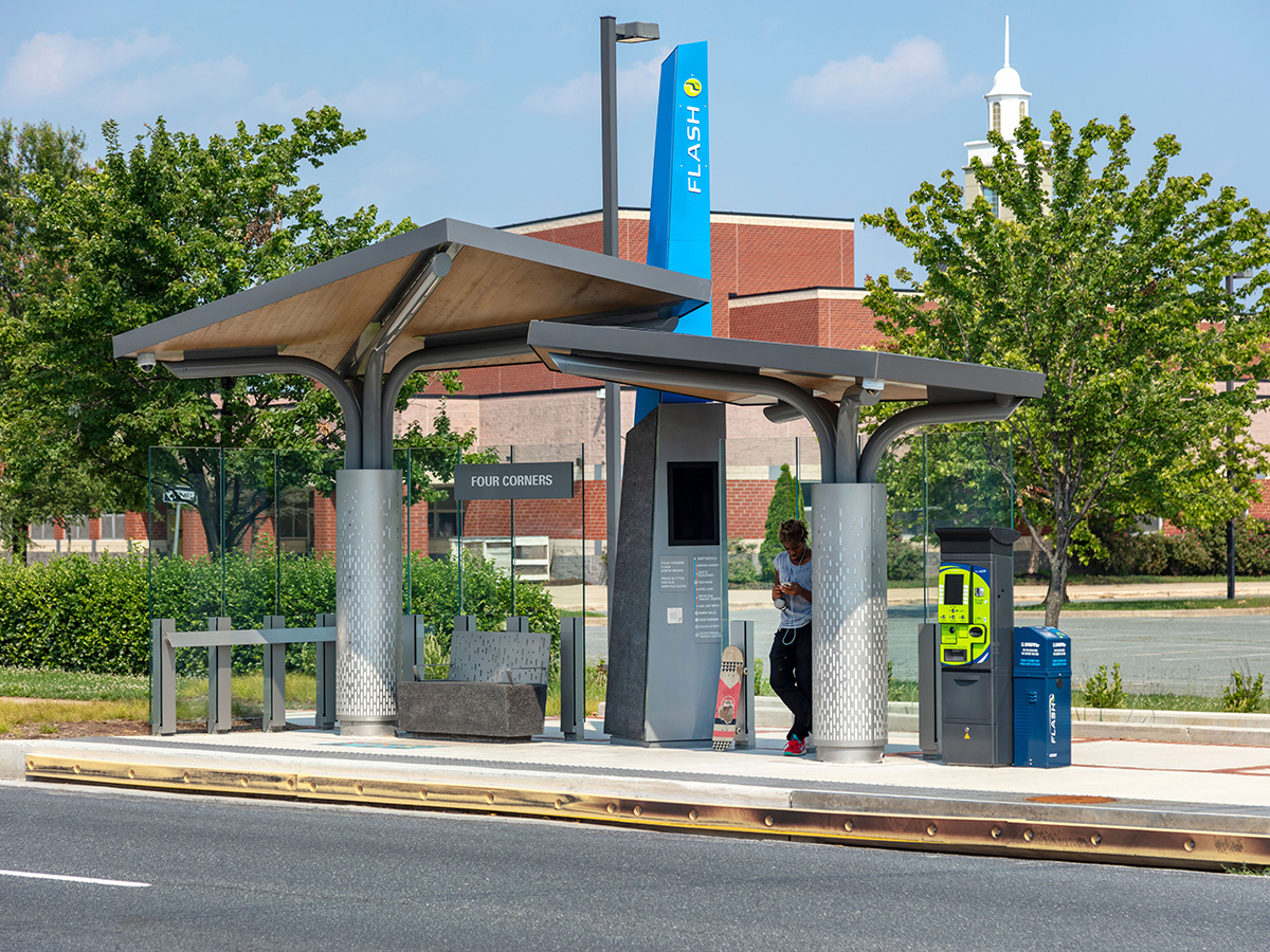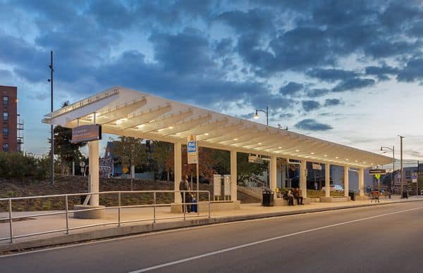 Amenities for LRT, YR and BRT stations may include seating, lighting, canopies, trash/recycling, real-time information signs, stations signage, fare machines, video surveillance, bike/scooter storage, emergency call boxes, wayfinding signage, and interactive kiosks. Other design elements may include level boarding, enhanced crosswalks, landscaping and greenery, fencing, and existing bus stops for parallel routes.